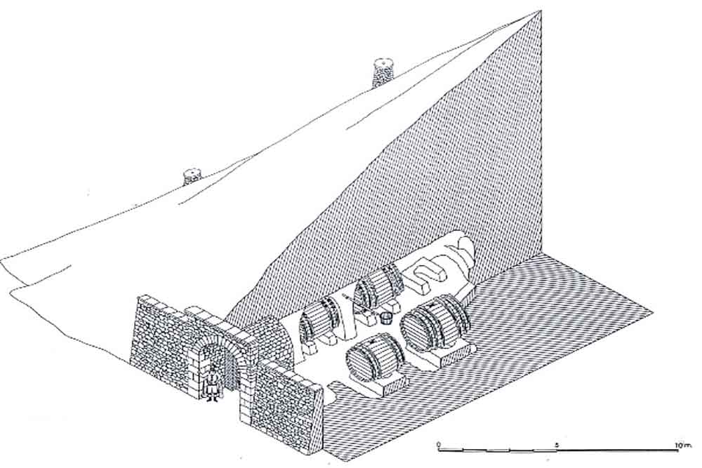 Bodega subterránea excavada en la ladera de un cerro, dedicada exclusivamente al almacenaje de vino.